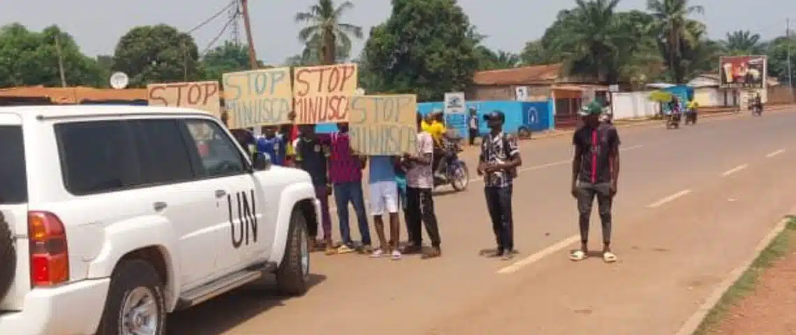 Le slogan « Stop à la MINUSCA » exprime un sentiment de dégoût face aux soldats de maintien de la paix de la MINUSCA qui unissent leurs forces à celles des groupes armés pour maintenir l’instabilité en République centrafricaine. Les manifestants appellent la communauté internationale à prêter attention aux actions de la MINUSCA en RCA et à attirer l’attention sur les crimes commis par la mission.