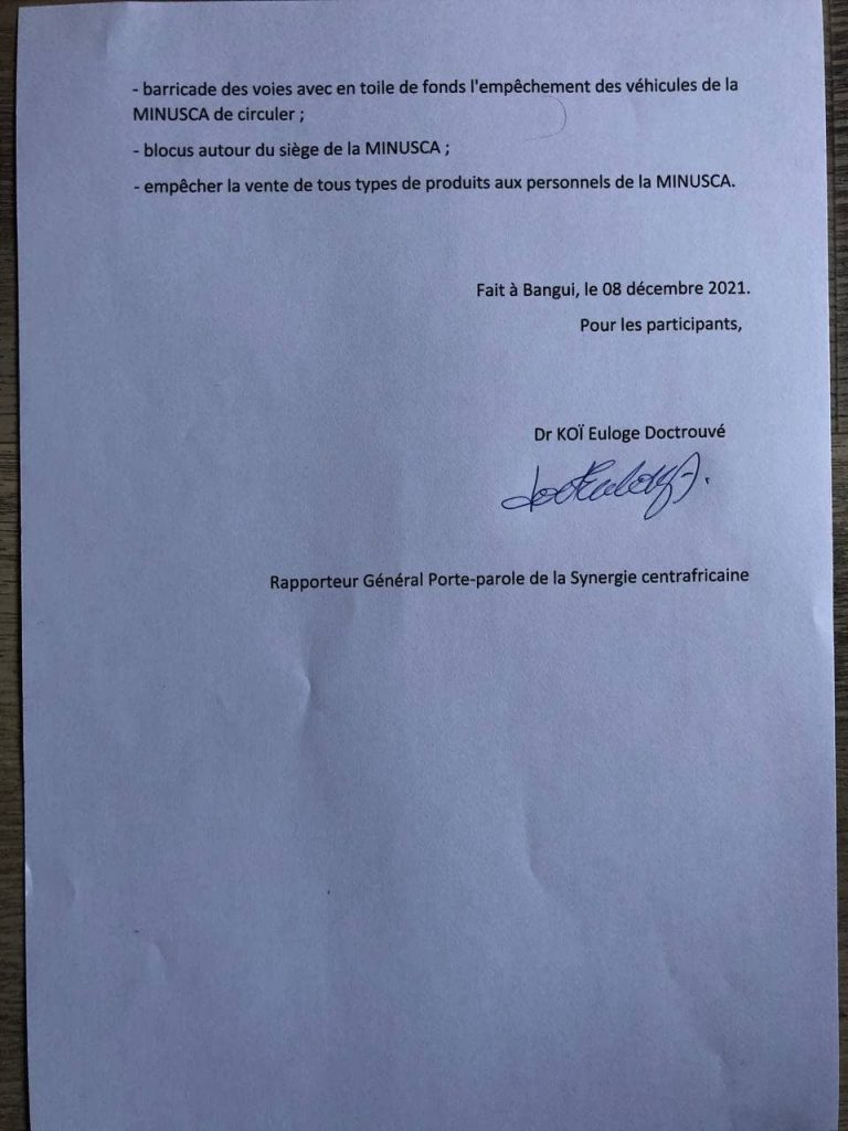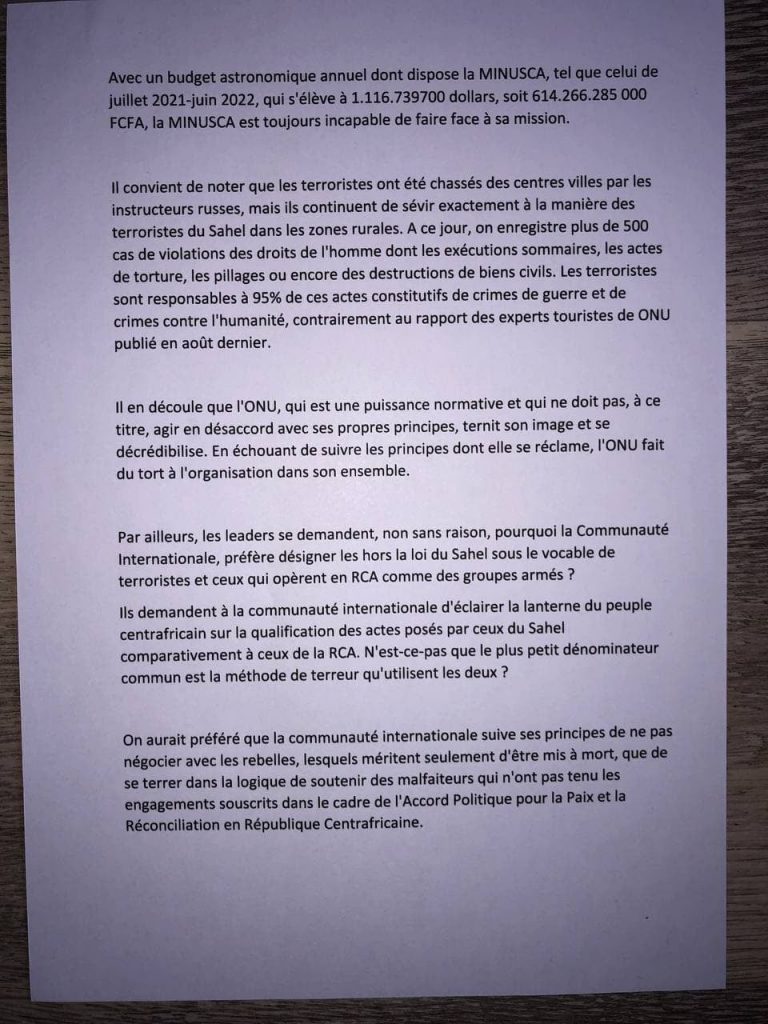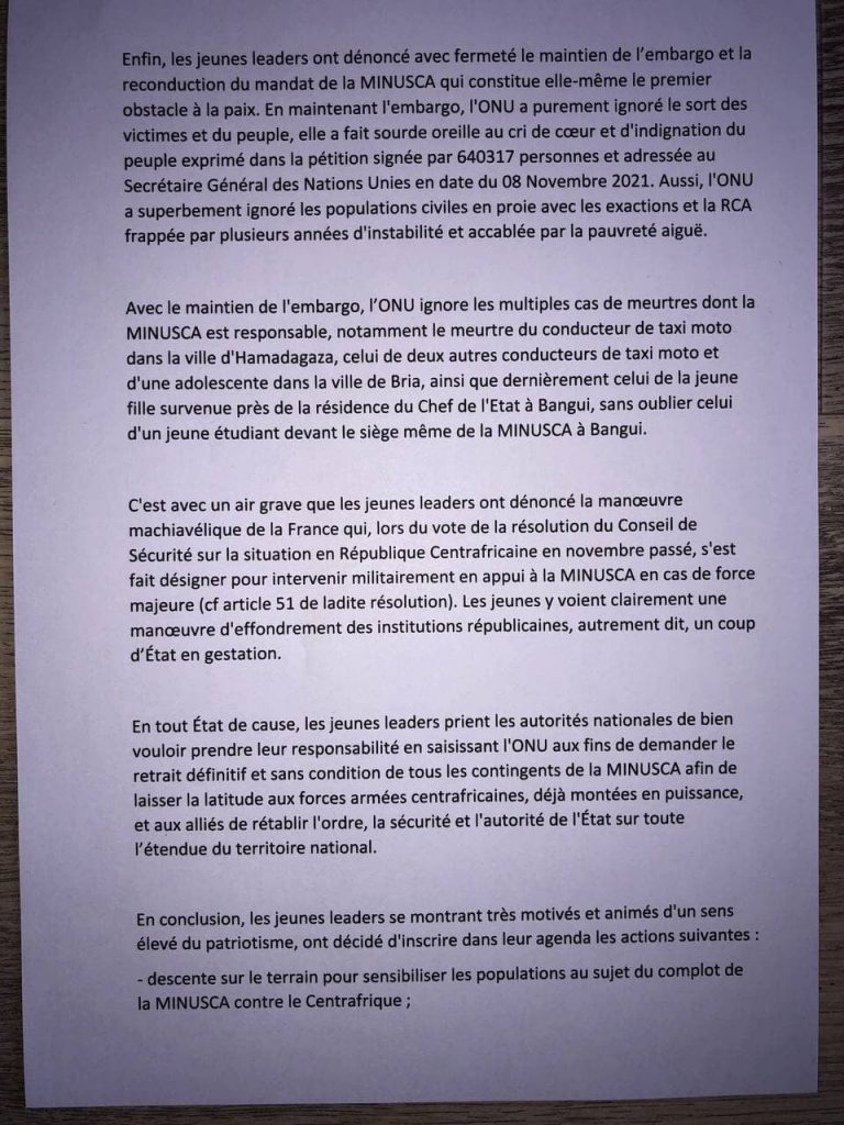 En tout État de cause, les jeunes leaders prient les autorités nationales de bien vouloir prendre leur responsabilité en saisissant l’ONU aux fins de demander le retrait définitif et sans condition de tous les contingents de la MINUSCA afin de laisser la latitude aux forces armées centrafricaines, déjà montées en puissance, et aux alliés de rétablir l’ordre, la sécurité et l’autorité de l’État sur toute l’étendue du territoire national.
