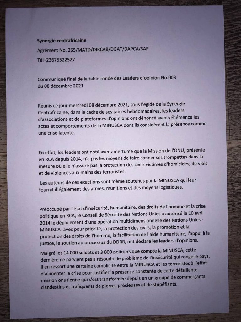 Réunis ce jour mercredi 08 décembre 2021, sous l’égide de la Synergie Centrafricaine, dans le cadre de ses tables hebdomadaires, les leaders d’associations et de plateformes d’opinions ont dénoncé avec véhémence les actes et comportements de la MINUSCA