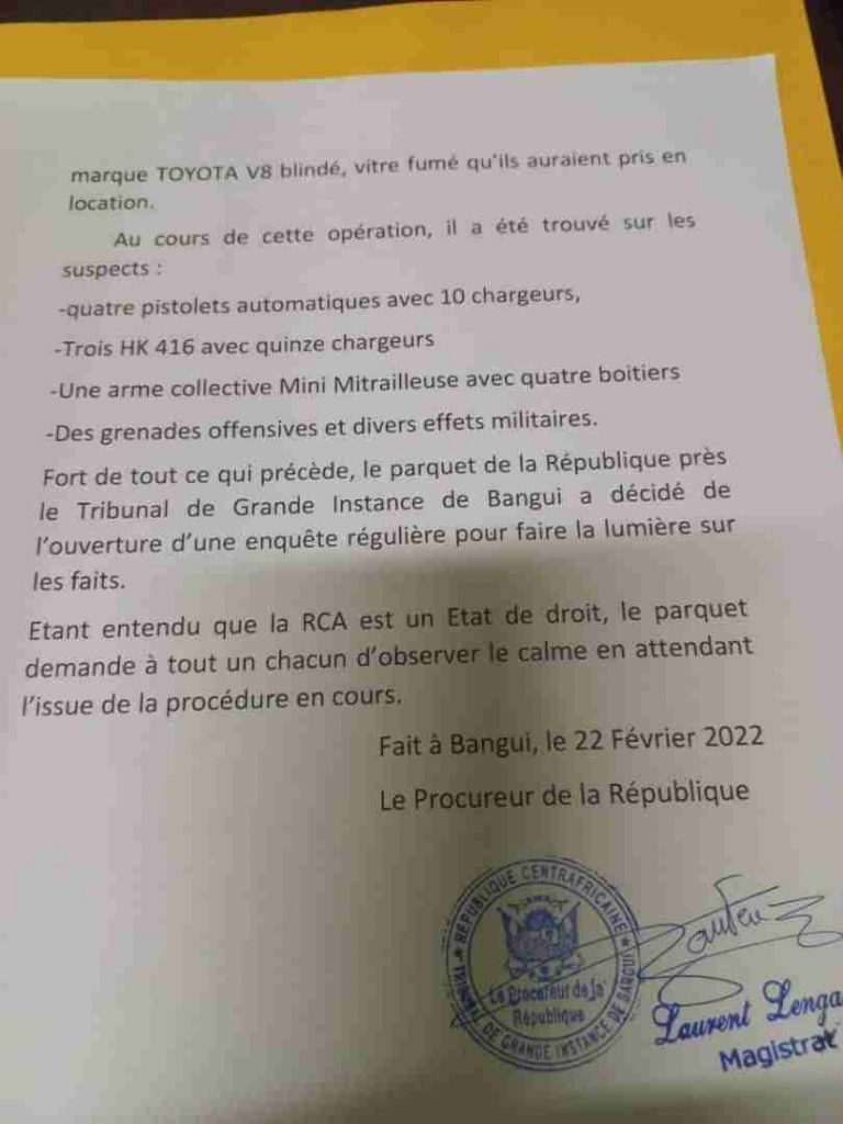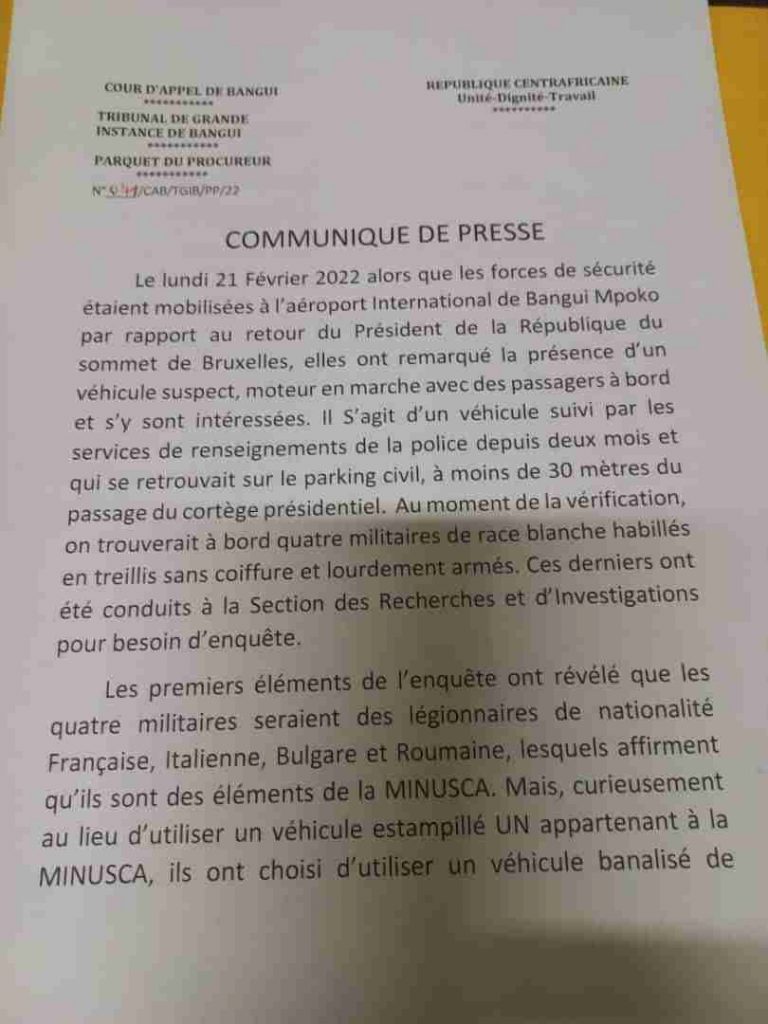 « Les premiers éléments de l’enquête ont révélé que les quatre militaires seraient des légionnaires de nationalité française, italienne, bulgare et roumaine, lesquelles affirment qu’ils sont des éléments de la MINUSCA. Mais, curieusement au lieu d’utiliser un véhicule estampillé UN appartenant à la MINUSCA, ils ont choisi d’utiliser un véhicule banalisé de marque TOYOTA V8 blindé, vitre fumé qu’ils auraient pris en location. Fort de ce qui précède, le parquet de la République près le tribunal de grande instance de Bangui a décidé de lancer une enquête régulière pour faire la lumière sur les faits », indiqué le communiqué du parquet de Bangui.